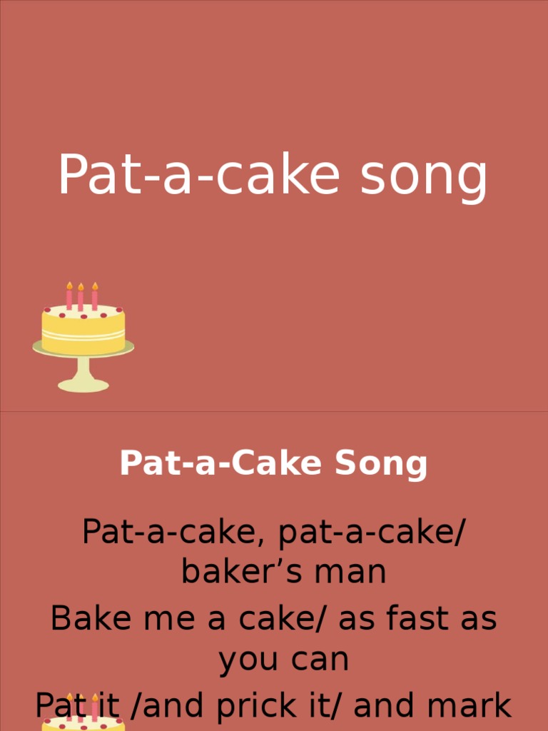 Pat-a-cake pat-a-cake bakers man. Bake me a cake as fast as you can Roll it pat it and mark it with a B Throw it in the oven for Baby and me. Pat-a-cake pat-a-cake bakers man.